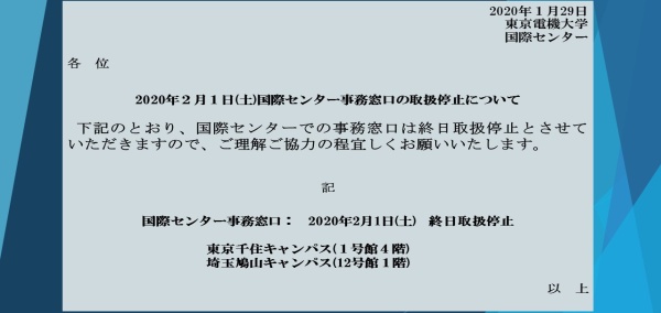 2020年2月1日(土)国際センター事務窓口の取扱停止について