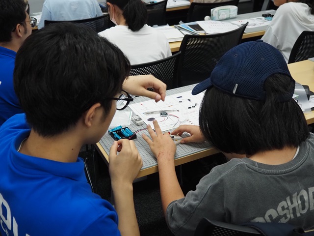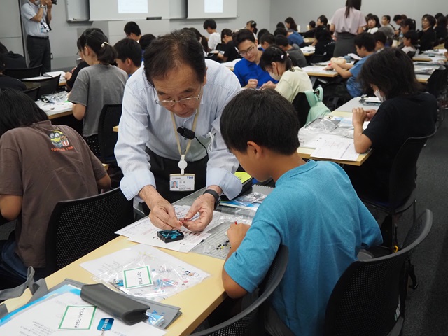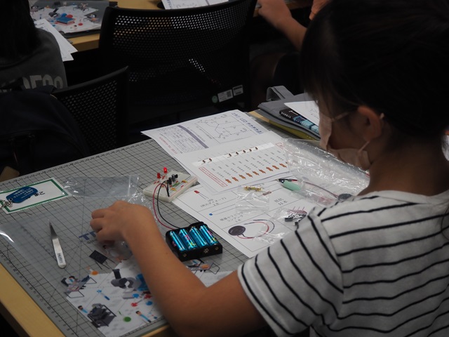 当日は、講師の定松宣義先生(工学部 情報通信工学科 非常勤講師)より、電気はどうやって作られているのか?電流や電圧とは何か?など「電気」について学び、実際に電子回路の製作にチャレンジしました。