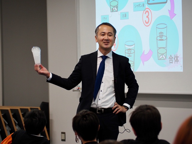 実際に観察した後、講師の小林宏史先生(工学部 先端機械工学科)より、光の特性について学びました。