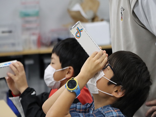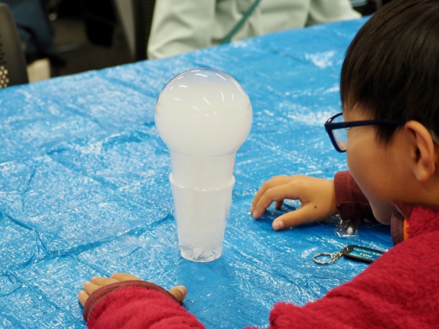 参加児童からは「シャボン玉をここまで詳しく観察するのが初めてで良く見たらこんなに色がたくさんあるのに気づけて良かった」「万華鏡を見たときに色の濃さや数が違ってきれいだった」「光の三原色について詳しく知れて良かった」、