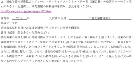本科目では、身近な環境問題を科学的に考え、環境にやさしく持続可能な社会の実現にむけた「ものづくり」の取り組みを概観することを目標にしている。また工学基礎教育から専門教育への橋渡しの役割を担っている。今までPBL支援プログラムとして実施することで、学生のアクティブラーニングを促し、①自学の姿勢、②コミュニケーションスキルの向上、③プレゼンテーション能力の向上、などの成果が得られている。講義の最終回には、企業等から講師をよび、実践的な課題についてグループディスカッションすることで、学生がそれまでに教科書等から得た基礎知識を元にした、社会における課題解決を図ってきた。学生アンケートの結果では、多くの学生が、講義を通して科目への興味・関心が高まったと回答している。