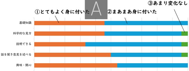どの分野も理解度が向上しており、学生自身が学習効果を実感している。環境問題に関する基礎知識、環境問題に関する科学的な見方、環境や資源の問題に関してわかりやすく説明する、人の話を聞き、自分の意見を述べる、環境や資源の問題に興味や関心をもつ に関するアンケート結果からも多くの学生が、講義を通して科目への興味・関心が高まったと回答している。