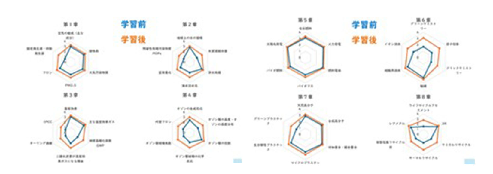 科目設定で掲げている分野の学習前と学習後の知識チェックを行い、学習後の理解度を可視化している。