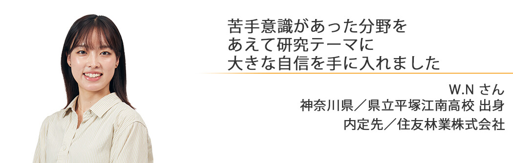 卒業研究では、木材でできた構造体に長期間荷重をかけ、時間の経過による変形の様子を実験で調べています。研究テーマは、木を使ったデザイン性の高い住宅を扱う内定先の企業と関連が深く、就職活動でもアピールできました。今後は、お客さまが思い描く理想の住まいを形にできる設計士を目指したいです。
