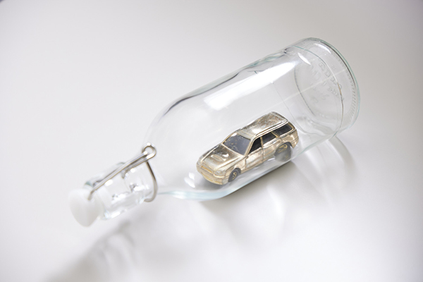 酒の空き瓶に閉じ込められた車をモチーフに、飲酒運転防止の新聞広告を作成。