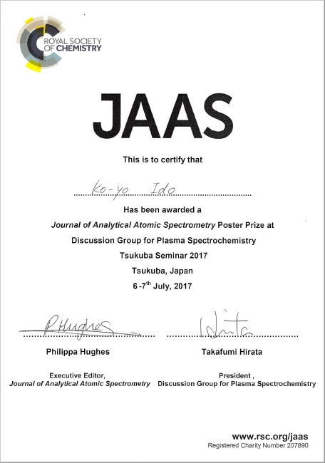 7月6日から7日に行われた、プラズマ分光分析研究会主催「2017筑波セミナー」にて、物質工学専攻の井戸さんが受賞者2名の最優秀賞、Journal of Analytical Atomic Spectrometry Poster Prize を受賞し、Royal Society of Chemistry(英国王立化学会)およびプラズマ分光分析研究会から表彰されました。