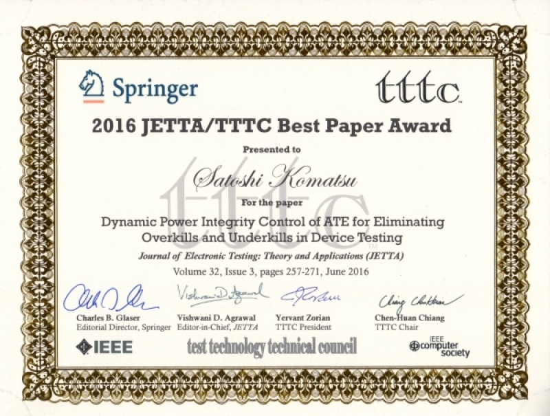 11月2日、米国テキサス州フォートワースで開催のIEEE International Test Conferenceにて、電子システム工学科 小松聡教授が、JETTA/TTTC論文誌の「2016 Best Paper Award」を受賞しました。