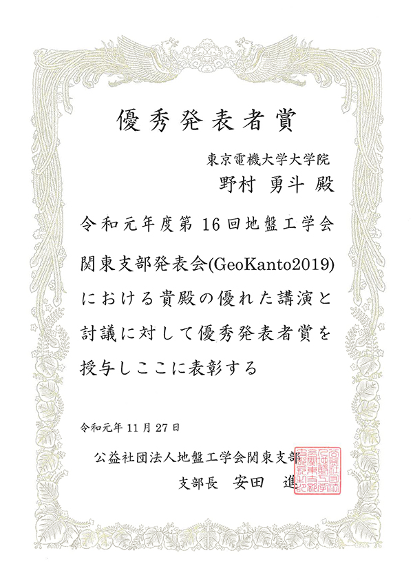 11月2日、国立オリンピック記念青少年総合センターにて行なわれた、地盤工学会関東支部主催「第16回地盤工学会関東支部発表会 GeoKanto2019」にて 建築・都市環境学専攻 野村勇斗さんが優秀発表者賞を受賞しました。