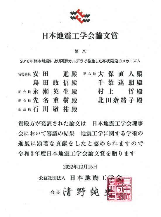 本学 安田進名誉教授、理工学部 建築・都市環境学系 島田政信教授、石川敬祐准教授が「日本地震工学会 論文賞」を受賞しました。