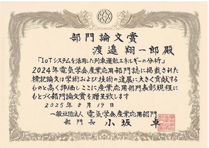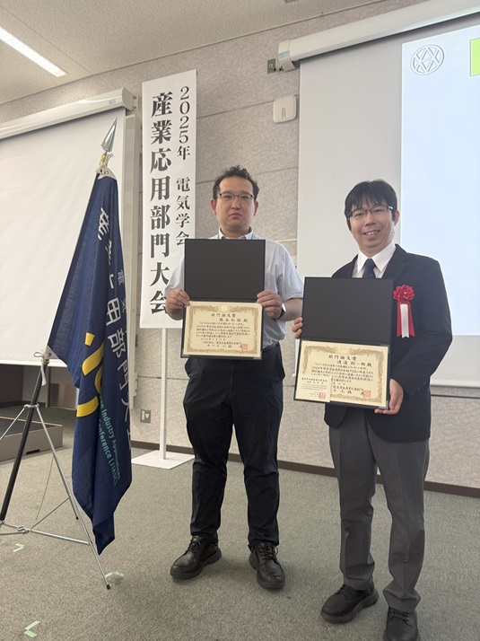 電気電子工学科 渡邉翔一郎准教授が8月に開催された2025年電気学会産業応用部門大会において、電気学会産業応用部門「部門論文賞」を受賞しました。