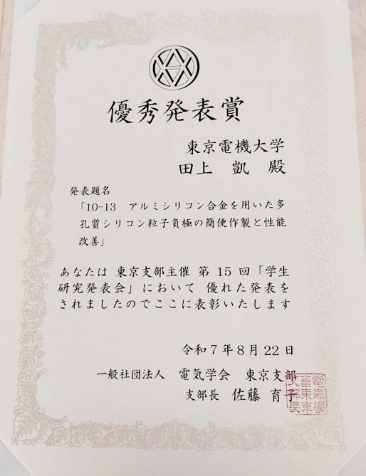 8月22日に早稲田大学で開催された電気学会東京支部「第15回学生研究発表会」にて、工学研究科 電気電子工学専攻の田上凱さんが優秀発表賞を受賞しました。