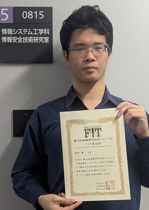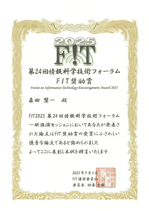 9月3日から5日に北海道科学大学で開催された、第24回情報科学技術フォーラム(FIT2025)において、システムデザイン工学研究科 情報システム工学専攻の森田慧一さんがFIT奨励賞を受賞しました。
