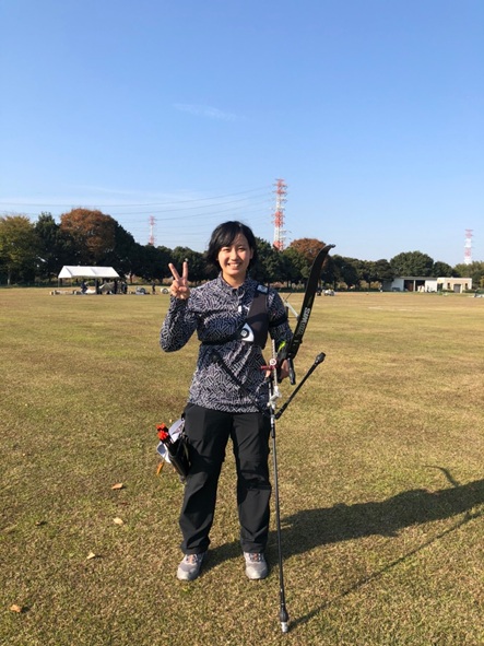 本学 総務部企画広報担当の小城碧さんは、現役時代ナショナルチームでアーチェリーの選手として活躍していました。