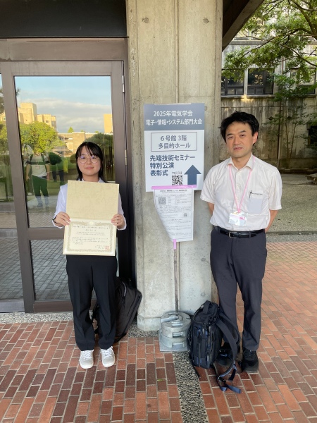 この度、電気学会 電子・情報・システム部門大会の学生ポスターセッションにおいて優秀ポスター賞を頂き、大変光栄に思っております。発表を通じて、学生や先生方からさまざまなご意見をいただき、大変貴重な経験となりました。今後も研究に励み、さらに成長していけるよう努力してまいります。