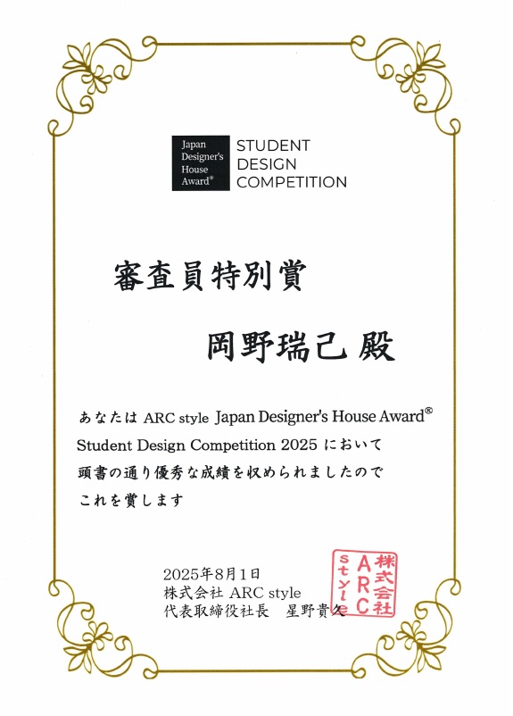 株式会社 ARC style主催の「第2回 ARC style 木造住宅コンペティション」において、理工学部 建築・都市環境学系の岡野瑞己さんが審査員特別賞を受賞しました。