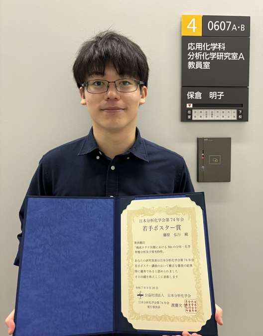 9月24日から26日に、北海道大学で行われた日本分析化学会 第74年会にて、工学研究科 物質工学専攻の藤原弘行さんが若手ポスター賞を受賞しました。