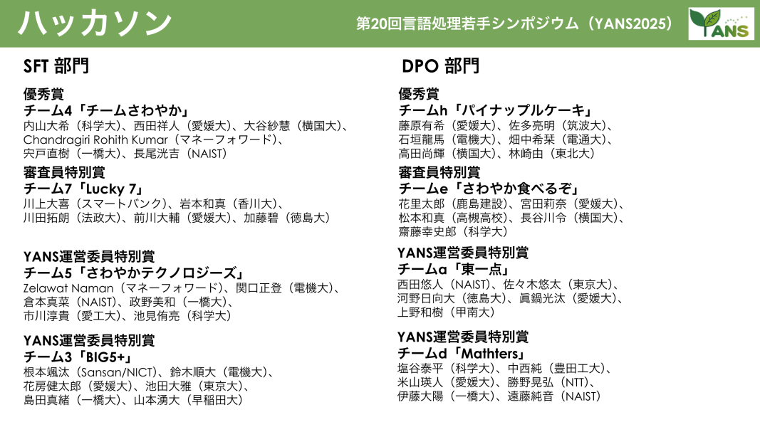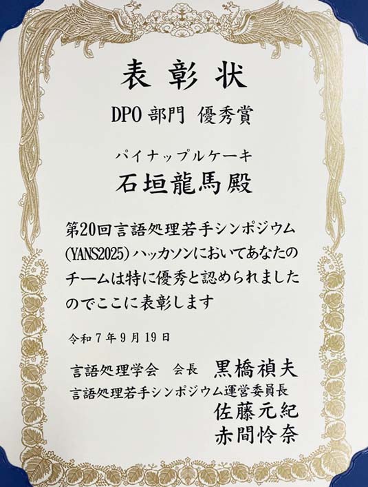データ科学・機械学習研究室のメンバーが「第20回言語処理若手シンポジウム(YANS2025)」にて行われた分野交流ハッカソンで、優秀賞、YANS運営委員特別賞を受賞しました。