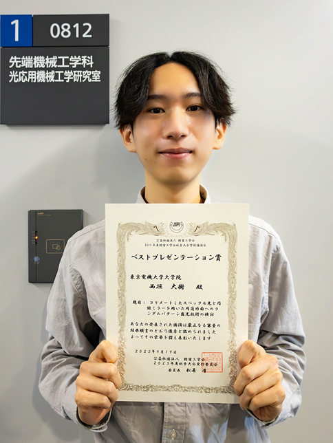 9月17日から19日に京都大学で行われた、2025年度 精密工学会 秋季⼤会学術講演会において、工学研究科 先端機械工学専攻の西垣大樹さんがベストプレゼンテーション賞を受賞しました。