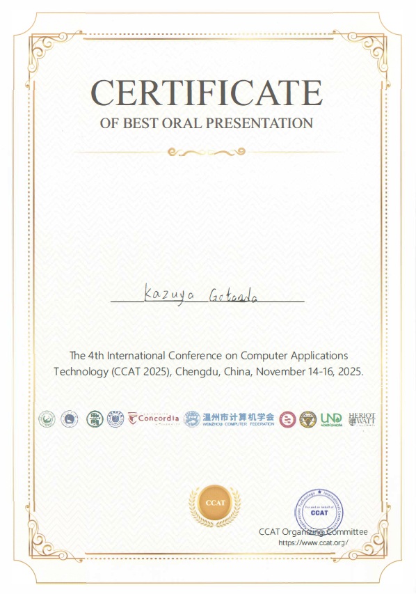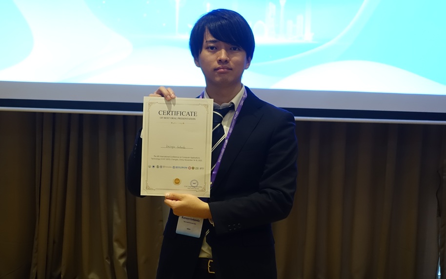 11月14日から16日に中国・成都市で開催された、国際会議The 4th International Conference on Computer Applications Technology(CCAT 2025)において、システムデザイン工学研究科 情報システム工学専攻の五反田和也さんがBest Oral Presentationを受賞しました。 これは、同会議での最高賞にあたります。