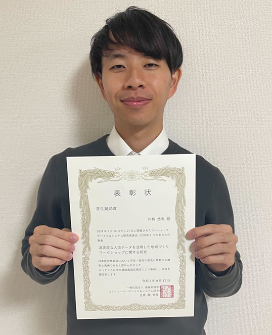 2024年度にシステムデザイン工学研究科 情報システム工学専攻修了の片桐悠馬さんが、情報処理学会 コンシューマ・デバイス&システム(CDS)研究会「2024年度学生奨励賞」を受賞しました。