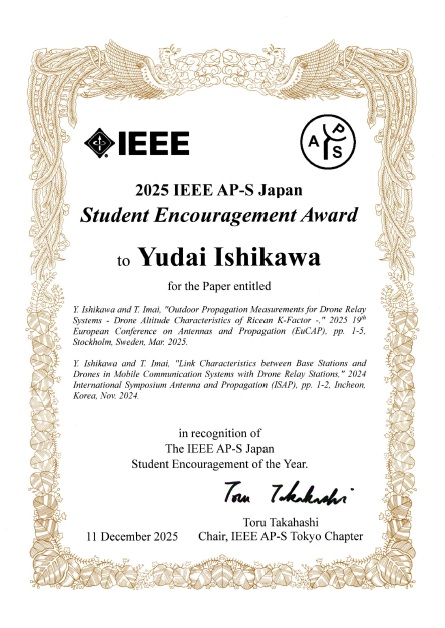 12月11日、工学研究科 情報通信工学専攻の石川裕大さんが、2025 IEEE AP-S Japan「Student Encouragement Award」を受賞しました。 この賞は、2023年9月から2025年8月の間に論文採録あるいは開催されたIEEE AP-Sが主催、共催、あるいは技術恊催する国際会議において筆頭著者として発表した査読付き国際会議論文の中から優秀な論文を発表した学生に対して贈られるものです。