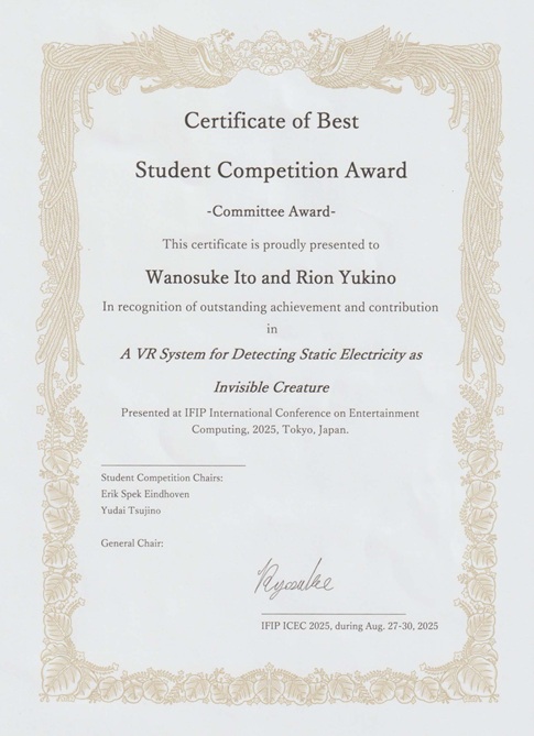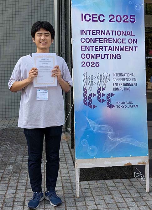理工学研究科 情報学専攻の雪野莉恩さんと、メディア数理研究室OBの伊藤和之丞さんが、エンタテインメントコンピューティングの代表的な国際会議ICEC 2025 (International Conference on Entertainment Computing)にて、Best Student Competition Awardを受賞しました。