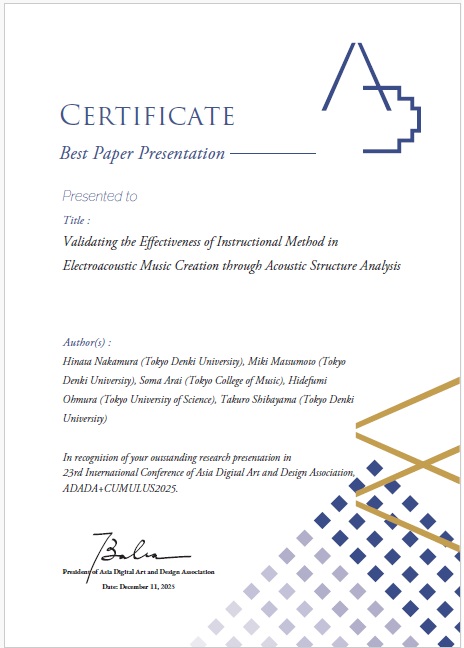 この度、ADADA+CUMULUS2025 において Best Paper Presentation Award を授与され、大変光栄に存じます。本研究は、具体音楽の創作を通じた創造性の向上支援教育をさらに発展させたいという思いから生まれたものです。今回の受賞にあたり、柴山教授をはじめ共同研究者の皆様、ならびに実験にご協力いただいた方々に心より感謝申し上げます。