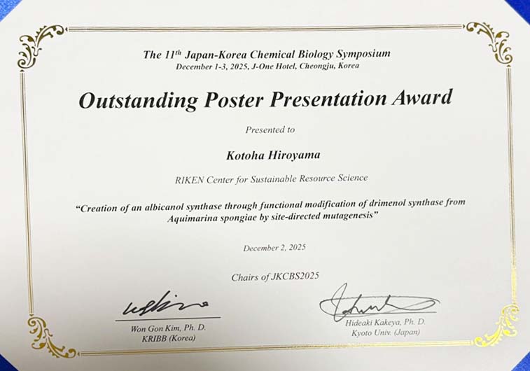 この度は、The 11th Japan-Korea Chemical Biology Symposiumでポスター賞を受賞することができ、大変光栄に思っております。指導教員の山本先生をはじめ、理化学研究所の高橋先生、研究を支えて下さった皆様に心より感謝申し上げます。国際学会に参加し、発表および受賞という貴重な経験を得られたことに感謝し、今後も研究活動に精進してまいりたいと存じます。