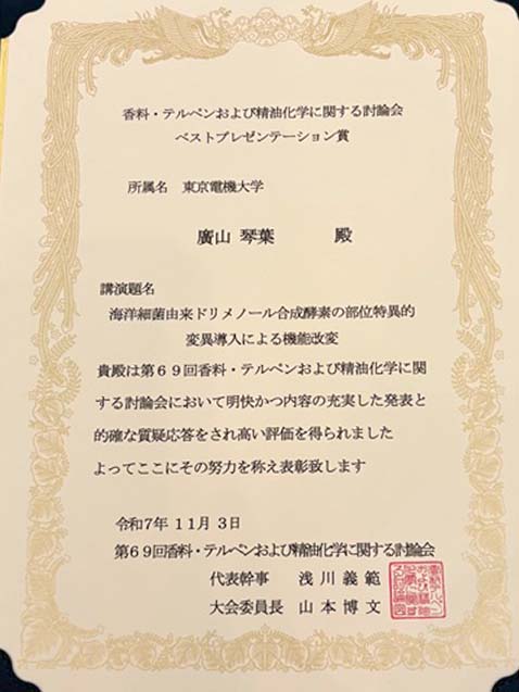 この度は、香料・テルペンおよび精油化学に関する討論会でベストプレゼンテーション賞を受賞することができ、大変光栄に思っております。本研究は、指導教員の山本先生をはじめ、日頃より研究にご指導いただいている理化学研究所の高橋先生、多くの方々のご支援・ご協力のもと進めることができました。研究を支えて下さった皆様に、心より感謝申し上げます。学会に参加し、発表および受賞という貴重な経験を得られたことに感謝するとともに、今後の研究活動に活かしていきたいと考えております。