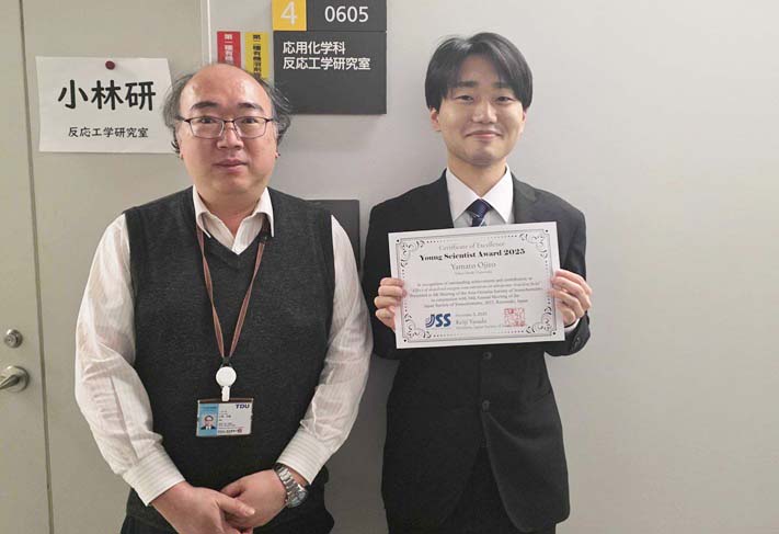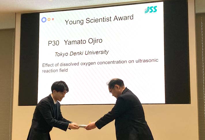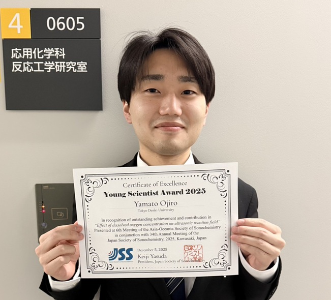 2025年12月3日から12月5日に川崎で開催された、6th Meeting of the Asia-Oceania Society of Sonochemistry (AOSS-6, 2025) in conjunction with 34th Annual Meeting of the Japan Society of Sonochemistry (JSS-34)において、工学部 応用化学科の尾白大翔さんがYoung Scientist Award 2025 を受賞しました。