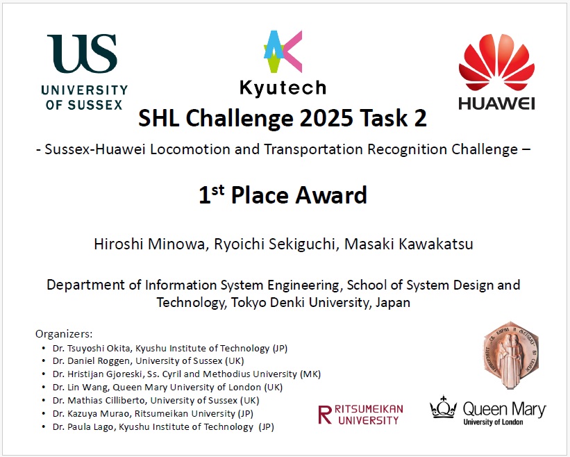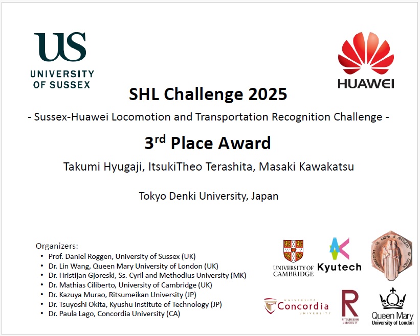 10月12日、フィンランド・エスポーで開催されたUbicomp 2025 内の国際ワークショップ HASCA 2025にて、「Sussex-Huawei Locomotion Challenge 2025」が行われ、本学大学院生が優秀な成績を収めました。箕輪さんと関口さんは昨年も第3位に入賞しており、2年連続の受賞となります。