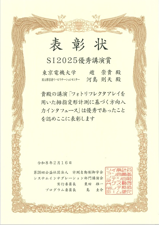 理工学部 電子情報工学系の趙助教が、第26回計測自動制御学会システムインテグレーション部門講演会(SI2025)にて優秀講演賞を受賞しました。
