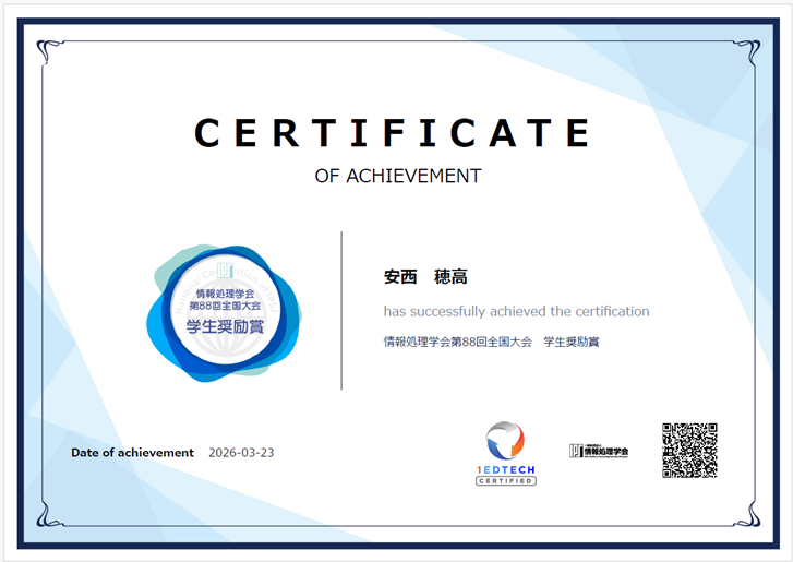 3月6日から8日まで開催された情報処理学会第88回全国大会において、未来科学部 情報メディア学科の安西穂高さんが、学生奨励賞を受賞しました。