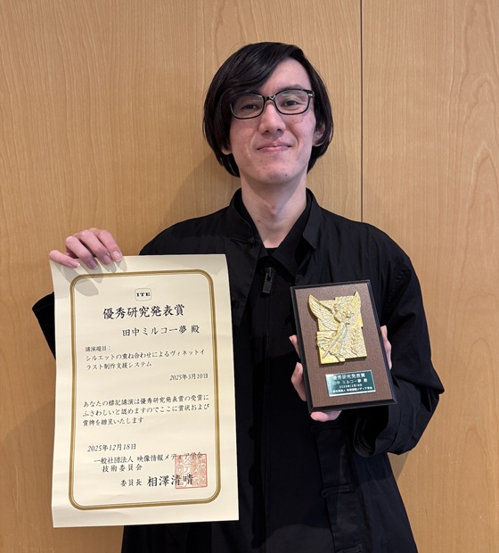 昨年12月に、未来科学研究科 情報メディア学専攻修了生の田中 ミルコ一夢さんが「映像情報メディア学会 第28回 優秀研究発表賞」を受賞しました。 この受賞は、令和7年3月(本学大学院在籍時)の発表が評価されたものです。