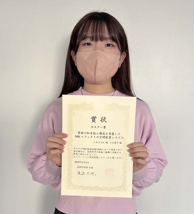 昨年12月に、未来科学部 情報メディア学科の三木すみれさんが「NICOGRAPH 2025」にてポスター賞を受賞しました。