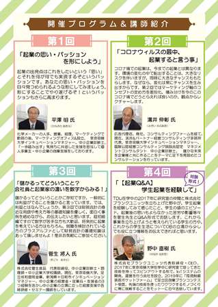 本講座は本学並びに他大学を含めた学生の皆さんを対象に、起業や創業を学ぶための講座となります。将来就職した後、ビジネスの世界や社会的事業(ソーシャルビジネス)においても必ず役立つ講座になります。是非ご参加ください!