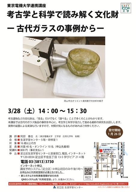 本講座では古代のガラス製品の事例を中心に、考古学と科学が協力して進める最新の研究をお話しします。
