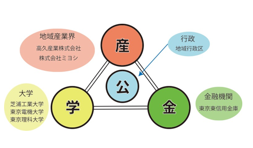この城東地域では、近年大学の立地が盛んになっており、本協議会に参画している芝浦工業大学(2006年、江東区)、東京電機大学(2012年、足立区)も、東京理科大学(2013年、葛飾区)も、新キャンパスを設置しています。また、城東地域を主な営業対象とする東京東信用金庫では、地域企業とのネットワークや産学連携を通した産業活性化の取り組みを推進しています。