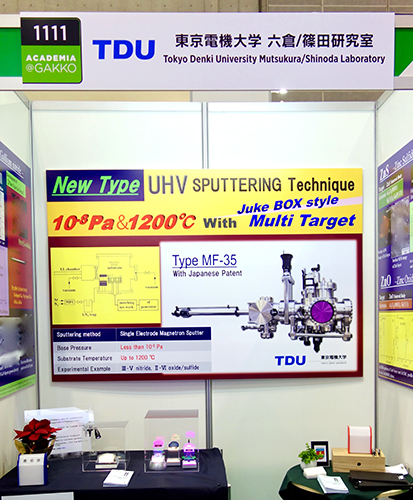 六倉教授、篠田准教授の研究室では、各種化合物半導体単結晶層の多層薄膜の形成を目的とした「低コスト・マルチターゲット型スパッタエピタキシー装置」の開発を行っています。SEMICON JAPANでは、高品質化合物半導体単結晶層の成長を低コスト・低環境負荷で実現可能なスパッタエピタキシー装置について詳しく紹介しました。研究成果に興味をもつ企業や公的機関の方々にご来場いただき、とても賑わいました。