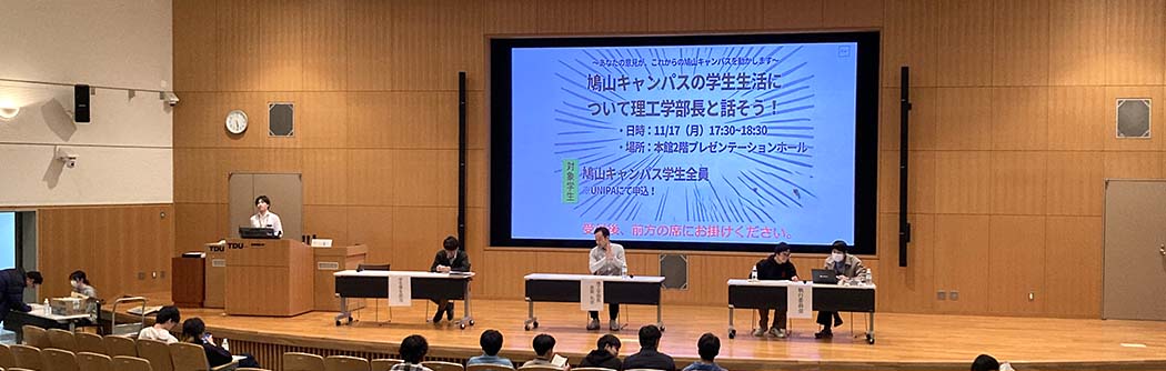 11月17日(月)、埼玉鳩山キャンパス本館2階プレゼンテーションホールにて、理工学部長と学生の対話企画「理工学部長と話そう!」を開催しました。当日は学年や学系の垣根を越えて51名の学生が参加し、クラブ活動や学食をはじめとした学生生活について、活発な議論が展開されました。