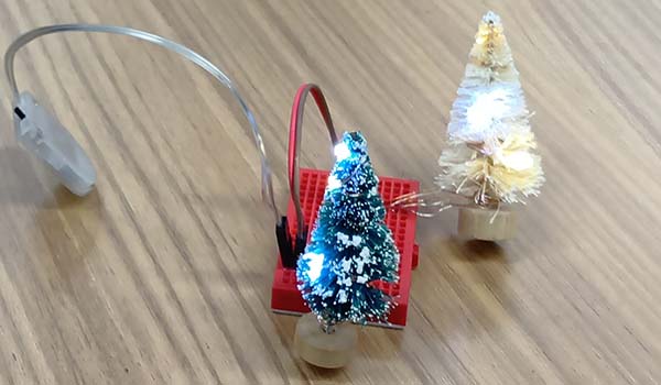 本学からは⼯学部の篠⽥宏之先⽣が講義と実験指導を⾏い、学⽣2 名が実験サポートをしました。冬休み中でしたが、参加した⽣徒たちはLED とムギ球の点灯実験に熱⼼に取り組み、また講義ではLED の特徴や仕組み、⾝近な活⽤例、さらに科学と⼯学の違いも学びました。後半ではミニツリーにLED を飾り付けてオリジナルツリー作りに熱中しました。