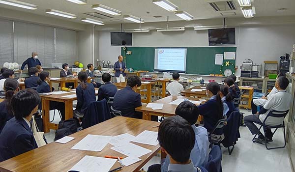 「パスタブリッジ競技会」はパスタを使ってブリッジを作り強度やデザインを競うもので、ものづくりに主体的に挑戦すること、理工系の関心をさらに深めることが目的です。大学からは建築学科の笹谷真通教授がミニ講義、講評で協力、建築構造研究室の学生2名(同校卒業生)も同行しました。
