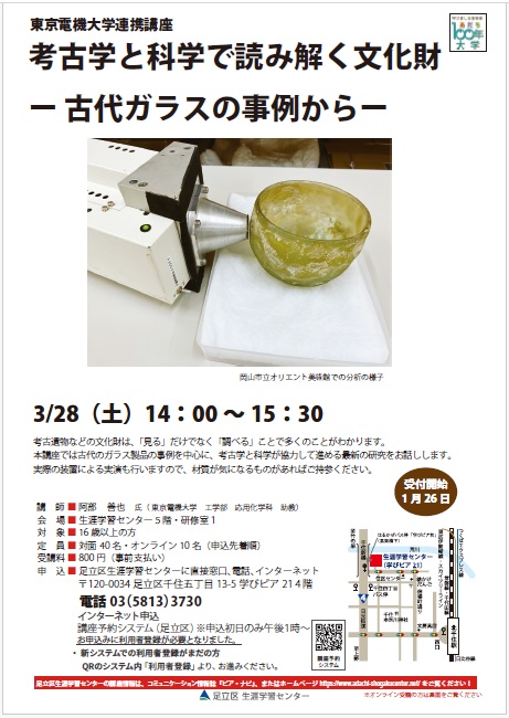 東京電機大学(学長 射場本忠彦)が協力する地域連携講座「考古学と科学で読み解く文化財—古代ガラスの事例から—」(主催:足立区生涯学習センター)が対面形式(会場:同センター)、およびオンライン形式(Zoomウェビナー)で開催されます。