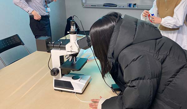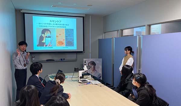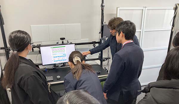 初めに大学紹介があった後、2班に分かれて2つの研究室とキャンパス見学をしました。デザイン工学科のデザインエコシステム研究室(大泉和也 准教授)では、モノヅクリのデザインの考え方に触れ、マウスの設計や栄養を考えた献立選択システム等の実例に興味を持った様子でした。また情報通信工学科の画像処理研究室(長谷川誠教授)では、同校卒業の院生も協力してスマホで眼球を撮影するドライアイの画像診断体験や毛髪のキューティクル観察を体験し、研究を身近に感じる機会となりました。キャンパス見学では、理工系ならではのものづくりセンター等の施設や設備、図書館など整った学習環境に驚いた様子でした。